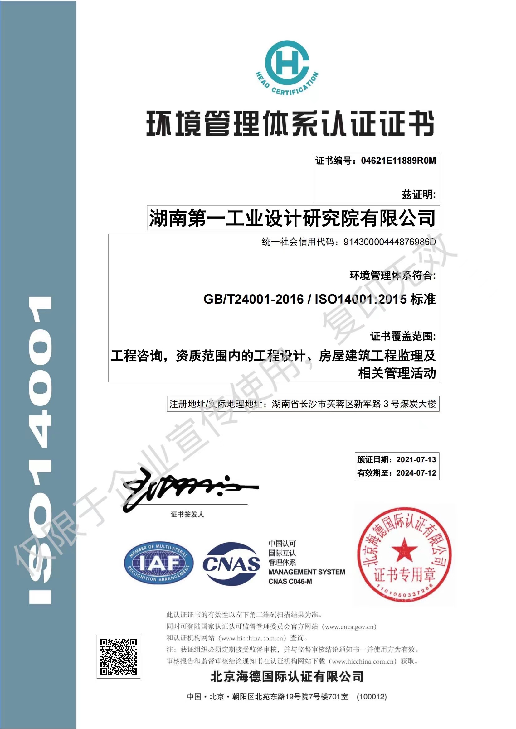 ISO14001環(huán)境管理體系認(rèn)證證書